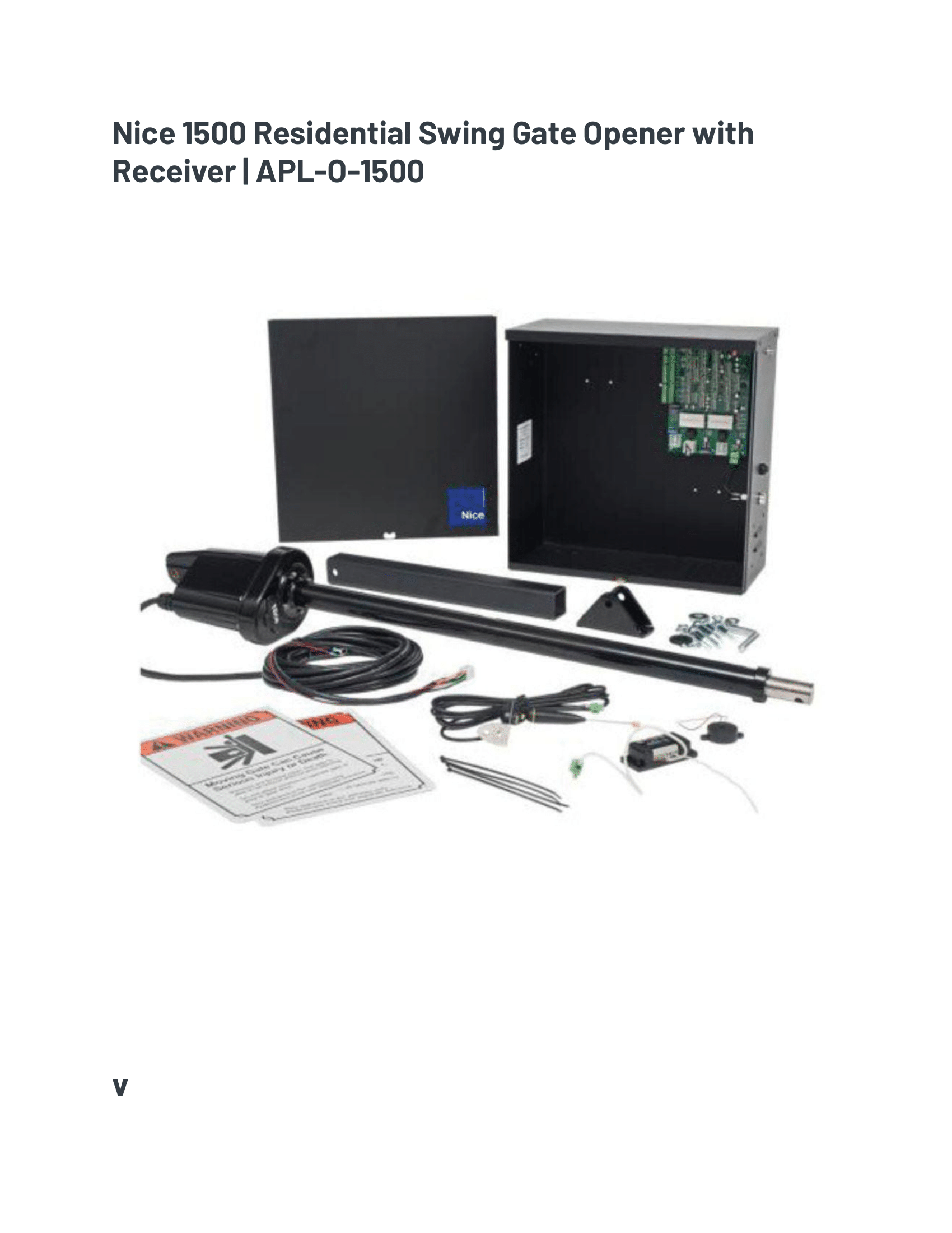The Nice 1500 Swing Gate Opener (also known as an Apollo swing gate operator or Apollo swing gate motor) is designed for gates up to 16 ft. in height and 600 lbs. in weight, and now includes a built-in receiver. The swing gate opener is easily installed and weather-resistant. The unit is rechargeable via 12V DC battery, solar, or AC, with a 2-year warranty. Apollo gate openers are one of our best sellers.