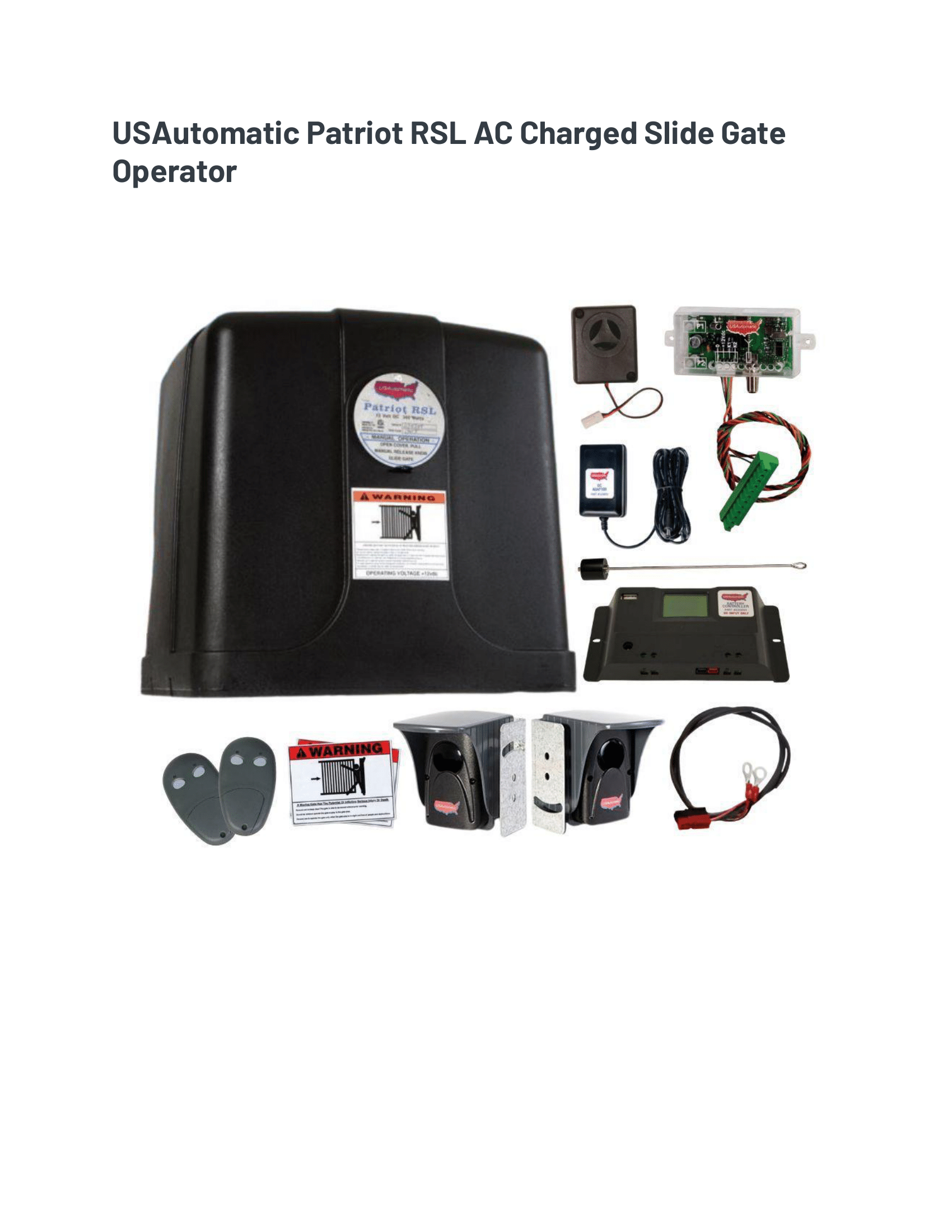 The USAutomatic Patriot RSL AC Charged Slide Gate Opener Kit with LCR offers a powerful and dependable solution for automating residential and light commercial slide gates. Utilizing a robust AC-charged power system, this comprehensive kit ensures continuous and reliable operation, complemented by a battery backup that guarantees uninterrupted access during power outages. Designed for smooth and consistent performance, the Patriot RSL provides enhanced security and effortless convenience for your property, capable of handling various slide gate applications with ease.